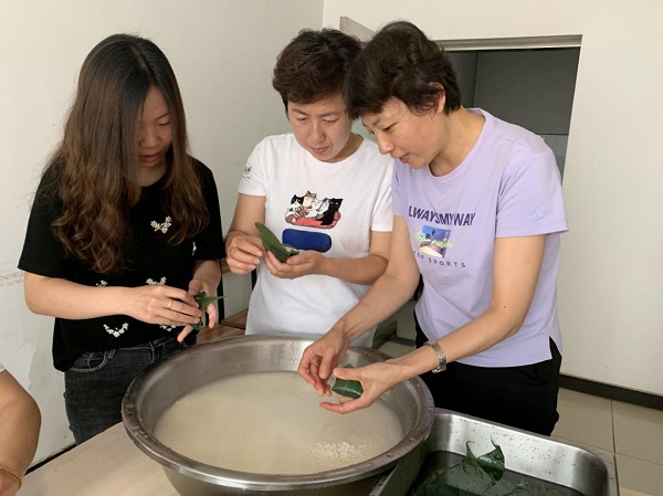 上午9點,粽葉、糯米、大棗整齊地擺上桌。大家邊包邊聊,其樂融融。在包粽子現(xiàn)場,熟悉包粽子的能手們飛快地拿起粽葉,兩手一窩卷成漏斗狀,填米、加棗、壓緊、扎繩,一氣呵成。她們還充當起“老師”的角色,教“新手”職工包粽子,手把手現(xiàn)場教學,“老師”教得仔細,“學生”學得認真,但要做出餡料十足、外觀漂亮的粽子還是需要費一番功夫的。隨著技巧的不斷嫻熟,一個多小時的時間,形狀各異、大小不一的一百多個粽子就堆積成山了,預算科副科長竇夢娜說:“我們包粽子的水平真是越來越高了,明年再包會更好!”此時每個人心里都洋溢著一股喜悅之情,有初學一門手藝的欣喜,有參與集體活動交流感情的滿足。