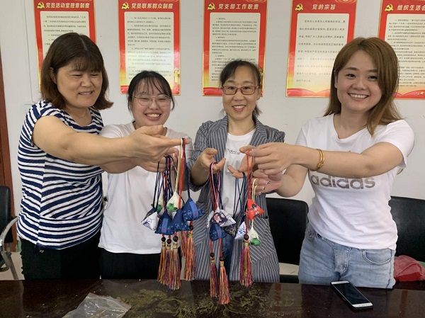 在傳統(tǒng)習俗中,玲瓏可愛的各色香包也是端午節(jié)必不可少的元素。包完粽子后大家轉移陣地到了活動室,大家圍坐桌邊,面前堆放著一份份材料包,有棉布、艾草、針線、中國結流蘇。面對這個從來沒有做過的DIY,大家開始研究起來,有的用手機搜索縫制方法流程,有的直接比來比去親自摸索著縫起來。有職工說:“這有點像咱們小時候老人們縫的毽子,那個里面裝的是五谷雜糧,咱們現(xiàn)在裝的是艾草。”“這香囊可以掛在辦公室或者車上,有清香、驅蚊的功效。”“我算是知道了,這個流蘇應該縫在這個邊的中間,而不是角上……”大家你一句我一句,手中的針線穿梭在棉布間,用密密的針腳縫制出傳統(tǒng)佳節(jié)最好的注解,用絲絲線線纏繞出端午安康的美滿寓意,一個個精巧可愛的三角香囊在大家的努力下完美呈現(xiàn)。