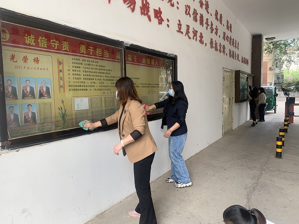 院內(nèi)整理清掃完畢后,大家又轉(zhuǎn)移陣地到辦公樓內(nèi),對辦公室、廁所、樓道等區(qū)域進(jìn)行了打掃。黨員們充分發(fā)揚(yáng)“甩開膀子、挑起擔(dān)子”的精神,擦拭玻璃、打掃地面、清理垃圾,全方位消毒噴殺,每一步都認(rèn)真到位,不留死角。經(jīng)過近三個(gè)小時(shí)的辛勤勞動,院里綠化帶的枯枝、雜草得到了整治,機(jī)關(guān)大院內(nèi)更加整潔美觀,環(huán)境煥然一新。機(jī)關(guān)辦公室窗明幾凈、一塵不染,所有衛(wèi)生死角被徹底清理。大家擦擦汗水,露出會心的微笑。