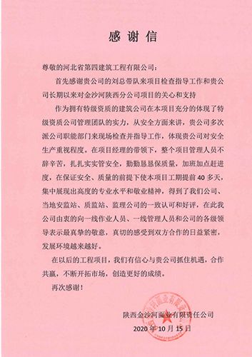 業(yè)主單位陜西金沙河面業(yè)有限責任公司在感謝信中,對公司管理團隊的專業(yè)水平和綜合實力給予了充分肯定,表達了今后與公司深化合作的意愿。來自不同單位的錦旗上,分別寫著“服務(wù)至上 誠信履約”“創(chuàng)精品工程 展鐵軍風采”“技術(shù)創(chuàng)新 高質(zhì)高量”,充分體現(xiàn)了對公司管理團隊誠信守責、真抓實干、技術(shù)過硬、能打勝仗工作作風的一致肯定。