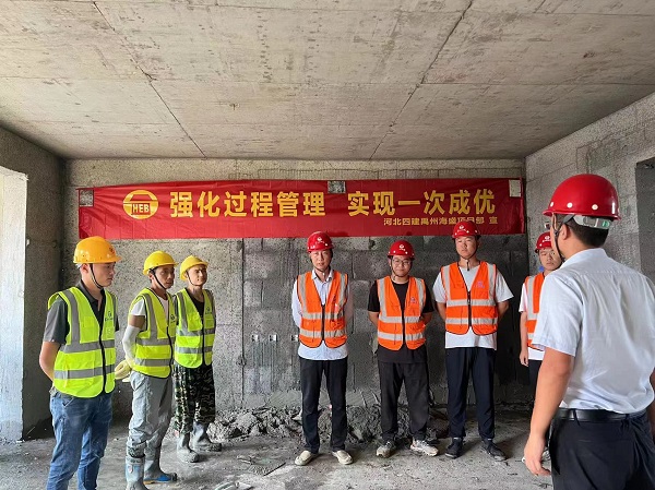 “為了強化全員質(zhì)量意識,弘揚工匠精神,促進操作技能、管理技能提升,現(xiàn)開展質(zhì)量月技能競賽……”項目主管師蔡昭作為總裁判作了賽前動員,宣布了比賽內(nèi)容、規(guī)則、程序、評分標(biāo)準(zhǔn)等,今年新入職職工、部分作業(yè)工人及工長觀賽。