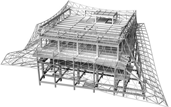 該工程表皮結(jié)構(gòu)采用圓鋼管相貫焊接的單層鋼網(wǎng)格結(jié)構(gòu),局部采用平面鋼桁架,表皮鋁板采用白色穿孔鋁板,雙曲穿孔鋁板外圈穿孔位置距邊線20mm,其余穿孔位置為不規(guī)則孔。面對(duì)外裝飾層鋼結(jié)構(gòu)造型復(fù)雜、精度要求高等挑戰(zhàn),項(xiàng)目部依托BIM技術(shù)構(gòu)建數(shù)字化解決方案,通過Tekla軟件精確計(jì)算桿件內(nèi)力和優(yōu)化拼裝單元,將傳統(tǒng)的二維圖紙轉(zhuǎn)化為三維可視化模型,便于更直觀地理解復(fù)雜節(jié)點(diǎn)和施工流程。利用Navisworks和BIMFILM軟件進(jìn)行施工動(dòng)畫模擬,通過三維可視化模型編排制作吊裝順序,形成吊裝三維演示動(dòng)畫,優(yōu)化施工順序和工序銜接,確保施工安全、質(zhì)量,有效提高施工效率。引入智能測(cè)量技術(shù),以全站儀、電子水準(zhǔn)儀等設(shè)備實(shí)時(shí)監(jiān)控安裝精度,形成“模擬預(yù)判+動(dòng)態(tài)糾偏”的質(zhì)量保障體系。在鋼網(wǎng)架安裝前,將全站儀、電子水準(zhǔn)儀、GPS定位系統(tǒng)采集的數(shù)據(jù)進(jìn)行綜合對(duì)比分析,提高測(cè)量放線精度,通過實(shí)時(shí)數(shù)據(jù)監(jiān)控及時(shí)調(diào)整施工過程中的誤差,實(shí)現(xiàn)動(dòng)態(tài)糾偏。鋼網(wǎng)架拼裝單元安裝完成后,通過實(shí)際測(cè)量采集數(shù)據(jù)與模型進(jìn)行對(duì)比,修正調(diào)整施工誤差。此外,項(xiàng)目部通過無人機(jī)掃描技術(shù)對(duì)安裝后的鋼結(jié)構(gòu)骨架成品空間坐標(biāo)進(jìn)行驗(yàn)收,為后續(xù)鋁板表皮安裝提供精準(zhǔn)數(shù)據(jù),確保建筑外觀效果與設(shè)計(jì)一致。